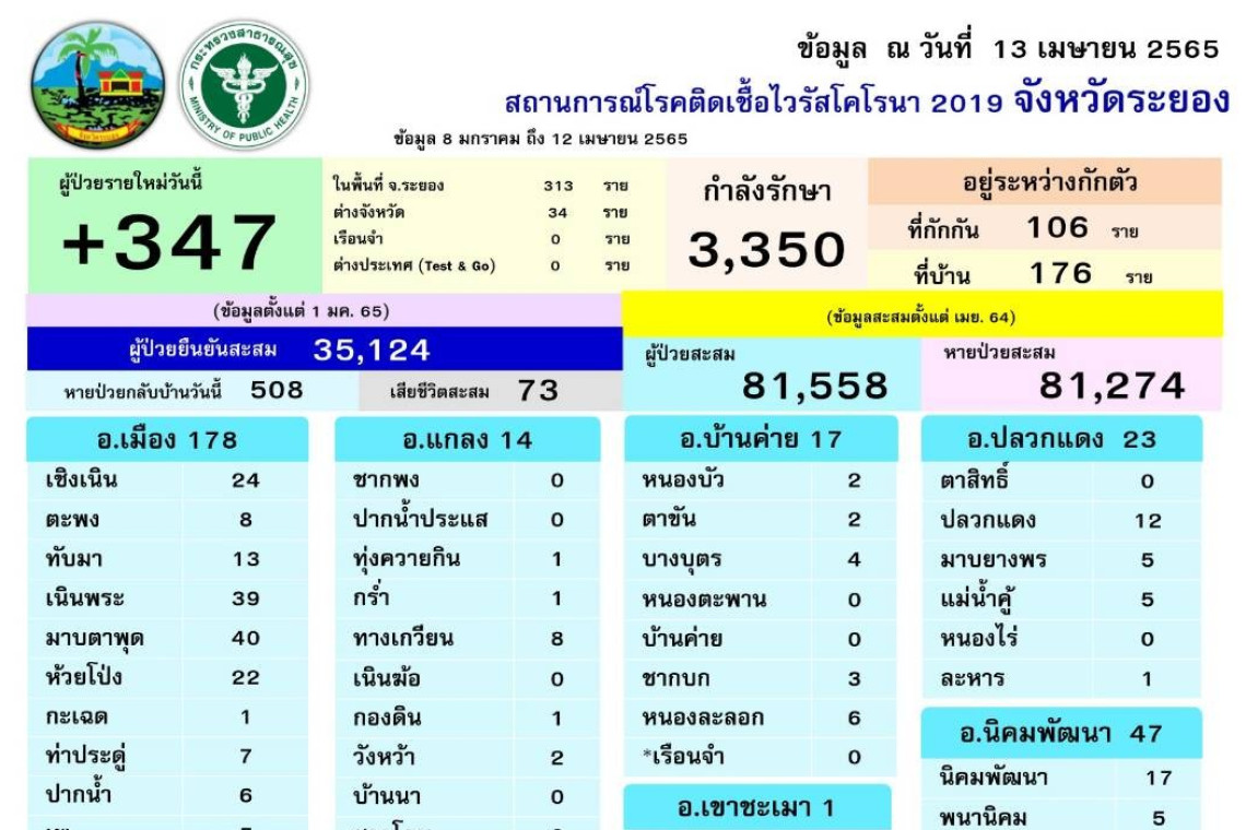 ดับอีก 2 ราย รับวันสงกรานต์ โควิด-19 ระยอง ยอดติดเชื้อพบเพิ่ม 347 ราย ติดเชื้อสะสม 81,558 ราย