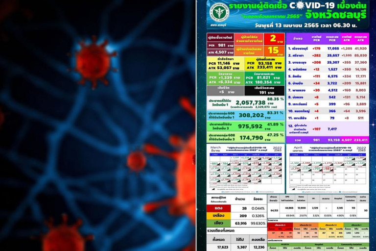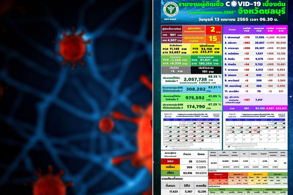 วันนี้ 13 เม.ย.65 สสจ.ชลบุรี มีรายงานพบผู้ติดเชื้อโควิด-19 รายใหม่ จำนวน 981 ราย (ผู้ติดเชื้อยืนยัน RT-PCR) จากคนที่พักอาศัยในจังหวัดระยอง เข้ามารักษาในจังหวัดชลบุรี 99 ราย จากจังหวัดอื่นๆ อีก 35 ราย จาก CLUSTER บริษัท ใน อ.ศรีราชา 3 ราย จากอาชีพเสี่ยงพบปะผู้คนจำนวนมาก 43 ราย
