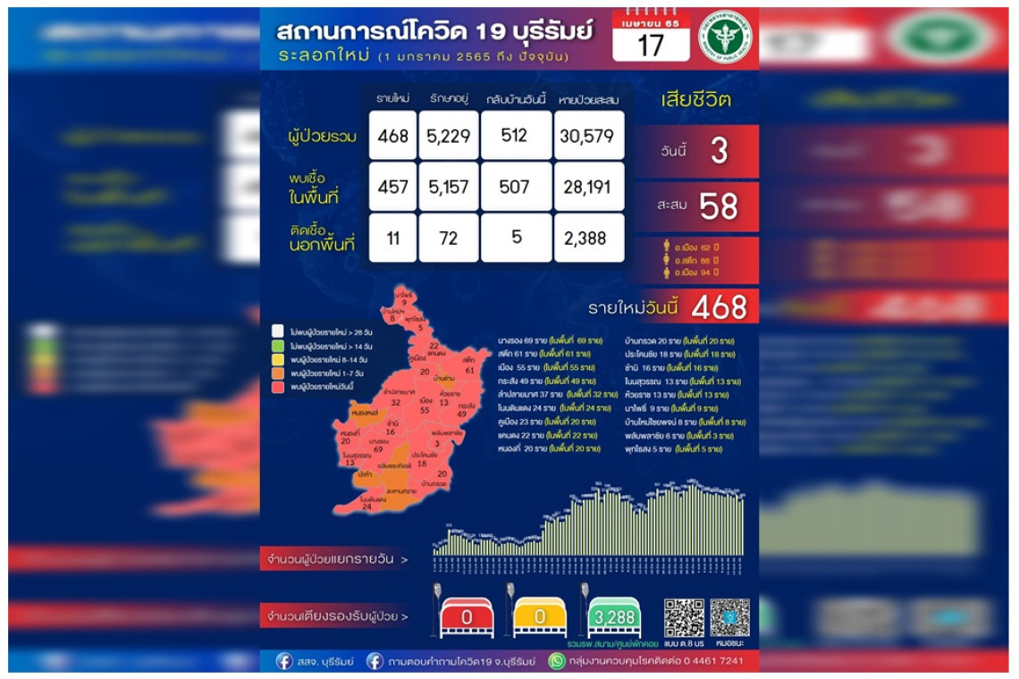 ทั้งนี้ พบว่า มีผู้ป่วยติดเชื้อรายใหม่ 468 ราย กระจายอยู่ในพื้นที่ 18 อำเภอ จากทั้งจังหวัด 23 อำเภอ ได้แก่ อำเภอนางรอง 69 ราย (ในพื้นที่ 69 ราย), อ.สตึก 61 ราย (ในพื้นที่ 61 ราย), อ.เมือง 55 ราย (ในพื้นที่ 55 ราย), อ.กระสัง 49 ราย (ในพื้นที่ 49 ราย), อ.ลำปลายมาศ 37 ราย (ในพื้นที่ 32 ราย), อ.โนนดินแดง 24 ราย (ในพื้นที่ 24 ราย), อ.คูเมือง 23 ราย (ในพื้นที่ 20 ราย), อ.แคนดง 22 ราย (ในพื้นที่ 22 ราย), อ.หนองกี่ 20 ราย (ในพื้นที่ 20 ราย), อ.บ้านกรวด 20 ราย (ในพื้นที่ 20 ราย), อ.ประโคนชัย 18 ราย (ในพื้นที่ 18 ราย), อ.ชำนิ 16 ราย (ในพื้นที่ 16 ราย), อ.โนนสุวรรณ 13 ราย (ในพื้นที่ 13 ราย), อ.ห้วยราช 13 ราย (ในพื้นที่ 13 ราย), อ.นาโพธิ์ 9 ราย (ในพื้นที่ 9 ราย), อ.บ้านใหม่ไชยพจน์ 8 ราย (ในพื้นที่ 8 ราย), อ.พลับพลาชัย 6 ราย (ในพื้นที่ 3 ราย) และ อ.พุทไธสง 5 ราย (ในพื้นที่ 5 ราย)