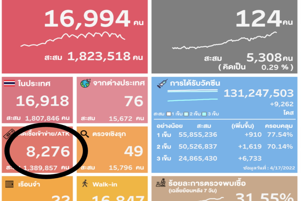 ข้อมูลกรมควบคุมโรค กระทรวงสาธารณสุข รายงานวันที่ 18 เม.ย.65 พบผู้ติดเชื้อรายใหม่ 16,994 ราย โดยพบผลตรวจ ATK เพิ่มอีก 8,276 ราย (ลดลงจากเมื่อวาน 13,617)รวมผลตรวจ ATK สะสมจำนวน 1,389,857 ราย โดยเมื่อรวมผลตรวจ ATK แล้วจะทำให้จำนวนผู้ติดเชื้อรายใหม่อยู่ที่ 25,270 ราย
