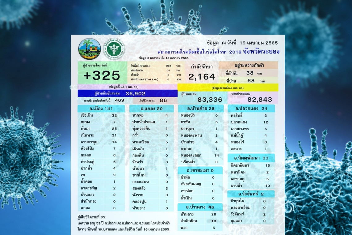 เมื่อวันที่ 19 เม.ย.65 ศูนย์ปฏิบัติการฯ โควิด-19 ระยอง โดยนายชาญนะ เอี่ยมแสง ผวจ.ระยอง รายงานสถานการณ์การแพร่ระบาดโควิด-19 ของ จ.ระยองว่า วันสวกรานต์ ปี 65 พบผู้ติดเชื้อโควิดเสียชีวิต 2 ราย รายแรกเป็นเพศชาย อายุ 59 ปี ชาว ต.ปลวกแดง อ.ปลวกแดง มีโรคประจำตัว ไตวาย เข้ารักษาตัว รพ.ปลวกแดง และเสียชีวิตวันที่ 16 เม.ย.อีกรายเป็นเพศชาย อายุ 70 ปี ชาว ต.ห้วยโป่ง อ.เมืองระยอง มีโรคประจำตัว ความดันโลหิตสูง หลอดเลือดสมอง ตับอักเสบ เข้ารักษาตัวที่ รพ.เฉลิมพระเกียรติฯ ระยอง และเสียชีวิตวันที่ 16 เม.ย.โดยมียอดผู้ติดเชื้อเสียชีวิตสะสมระลอกใหม่เพิ่มเป็น 86 ราย ส่วนผู้ติดเชื้อรายวันพบเพิ่ม 325 ราย ผู้ติดเชื้อสะสมละลอกใหม่เพิ่มเป็น 83,336 ราย หายป่วยแล้ว 82,843 ราย โดยพบผู้ติดเชื้อ 7 อำเภอ โดยพบสูงสุดอยู่ใน อ.เมืองระยอง 141 ราย รองลงมามี อ.บ้านฉาง 46 ราย อ.นิคมพัฒนา 33 ราย อ.บ้านค่าย 28 ราย อ.ปลวกแดง 24 ราย อ.แกลง 20 ราย อ.วังจันทร์ 2 ราย ต่างจังหวัดเข้ามารักษาตัว 31 ราย ยอดฉีดวัคซีนจังหวัดระยอง 2,049,672 เข็ม.