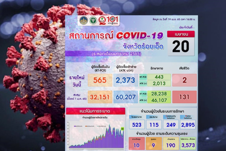 นายแพทย์ปิติ ทั้งไพศาล นพ.สสจ.ร้อยเอ็ด มอบหมายให้ จนท.รายงานสถานการณ์ไวรัสโคโรนา 2019 COVID-19 จังหวัดร้อยเอ็ด ประจำวันที่ 20 เมษายน 2565 ดังนี้ ผู้ติดเชื้อรายใหม่ วันนี้ (ระลอก มกราคม 2565)ใน20อำเภอจาก20อำเภอ 565 ราย ผู้ป่วยสะสม 32,151 รายรักษาหาย 443 ราย คงพยาบาล 3,782 ราย เสียชีวิต 2 ราย เสียชีวิตสะสม 131 ราย ยอดผู้ป่วยโควิด 19 ยืนยันสะสม ในจังหวัดร้อยเอ็ด ยอดสะสม :45,925 ราย เรือนจำ 11 ราย เสียชีวิตสะสม : 249 ราย