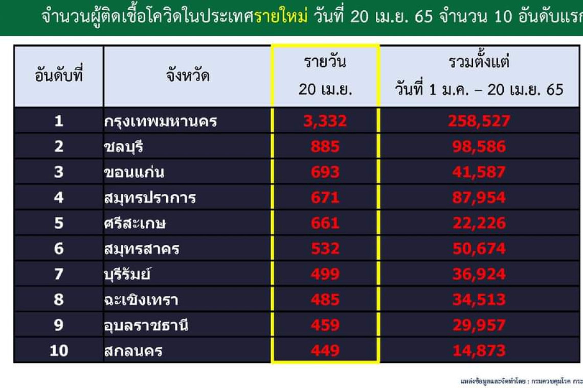 20 เม.ย.2565 ศูนย์ข้อมูลโควิด-19 รายงานสถานการณ์โรคติดเชื้อไวรัสโควิด-19 ข้อมูล ณ วันที่ 19 เม.ย.65 เวลา 01.00 น. ยังคงพบผู้ติดเชื้อรายใหม่ในทั้ง 77 จังหวัด โดย 10 อันดับจังหวัดติดเชื้อสูงสุด พบว่ากทม.ยังคงมีผู้ติดเชื้อรายใหม่อยู่ในอันดับ 1 อยู่ที่ 3,332 ราย เพิ่มขึ้นจากเมื่อวาน (จาก 3,282 ราย) อันดับ 2 ชลบุรี 885 ราย (จาก 650 ราย) อันดับ 3 ขอนแก่น 693 ราย (จาก 594 ราย) อันดับ 4 สมุทรปราการ 671 ราย (จาก 527 ราย) อันดับ 5 ศรีษะเกษ 668 ราย (จาก 396 ราย) อันดับ 6 สมุทรสาคร 532 ราย (จาก 469 ราย ) อันดับ 7 บุรีรัมย์ 499 ราย(จาก 445 ราย) อันดับ 8 ฉะเชิงเทรา 485 ราย (จาก 369 ราย) อันดับ 9 อุบลราชธานี 459 ราย (จาก 279 ราย) และอันดับ 10 สกลนคร 449 ราย(จาก 193 ราย)