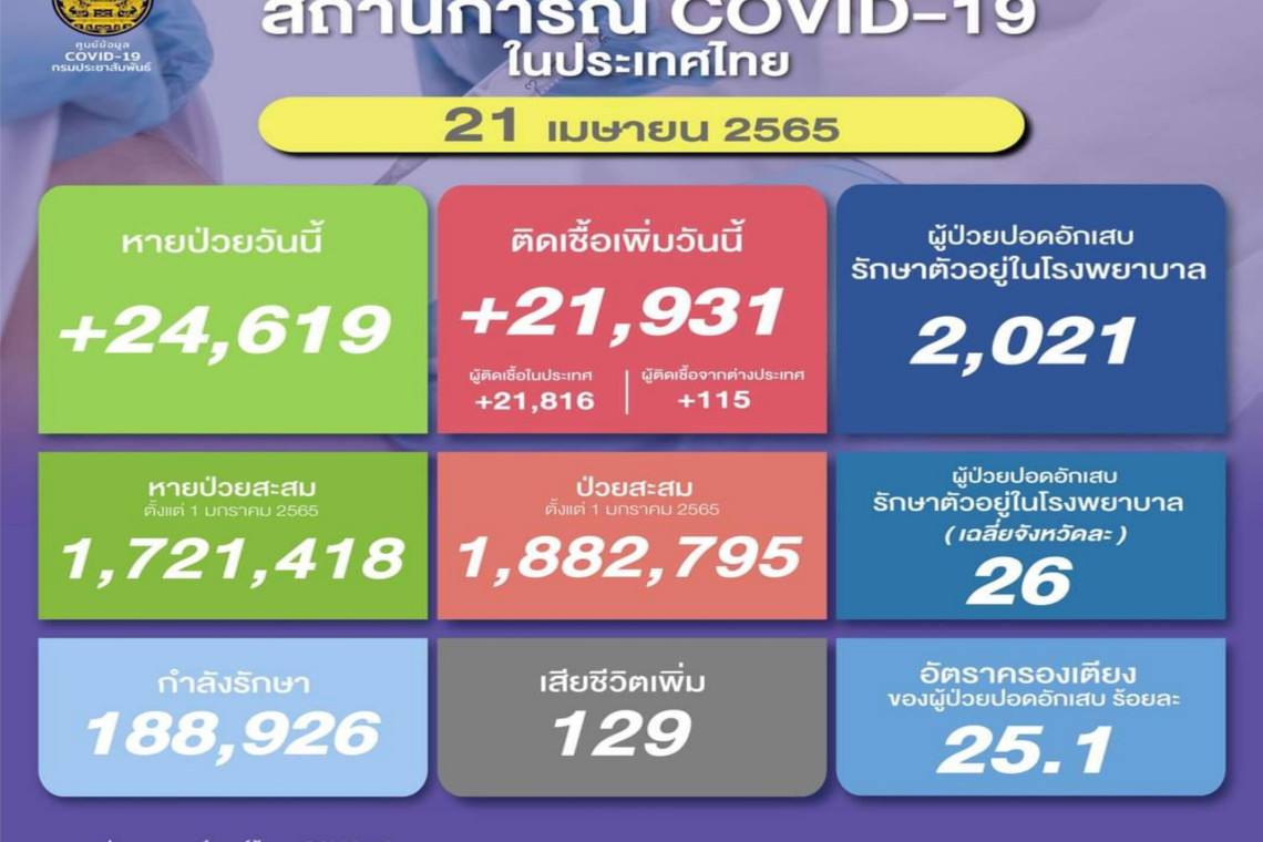 วันที่ 21 เม.ย.2565 ศูนย์ข้อมูล COVID-19 รายงานยอดผู้ติดเชื้อโควิด-19 รายใหม่จำนวน 21,931 ราย จำแนกเป็น ติดเชื้อในประเทศ 21,816 ราย ติดเชื้อจากต่างประเทศ 115 ราย ทำให้ยอดผู้ป่วยสะสมตั้งแต่ 1 มกราคม 2565 มีจำนวน 1,882,795 ราย