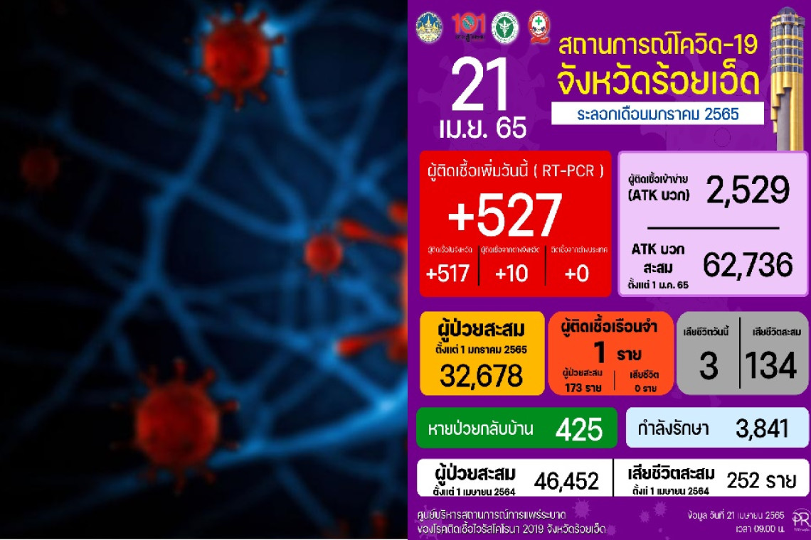 นายแพทย์ปิติ ทั้งไพศาล นพ.สสจ.ร้อยเอ็ด มอบหมายให้ จนท.รายงานสถานการณ์ไวรัสโคโรนา 2019 COVID-19 จังหวัดร้อยเอ็ด ประจำวันที่ 21 เมษายน 2565 ดังนี้ ผู้ติดเชื้อรายใหม่ วันนี้ (ระลอก มกราคม 2565)ใน19อำเภอจาก20อำเภอ 527 ราย ผู้ป่วยสะสม 32,678 รายรักษาหาย 425 ราย คงพยาบาล 3,841 ราย เสียชีวิต 3 ราย เสียชีวิตสะสม 134 ราย ยอดผู้ป่วยโควิด 19 ยืนยันสะสม ในจังหวัดร้อยเอ็ด ยอดสะสม 46,452 ราย เรือนจำ 1 ราย เสียชีวิตสะสม 252 ราย