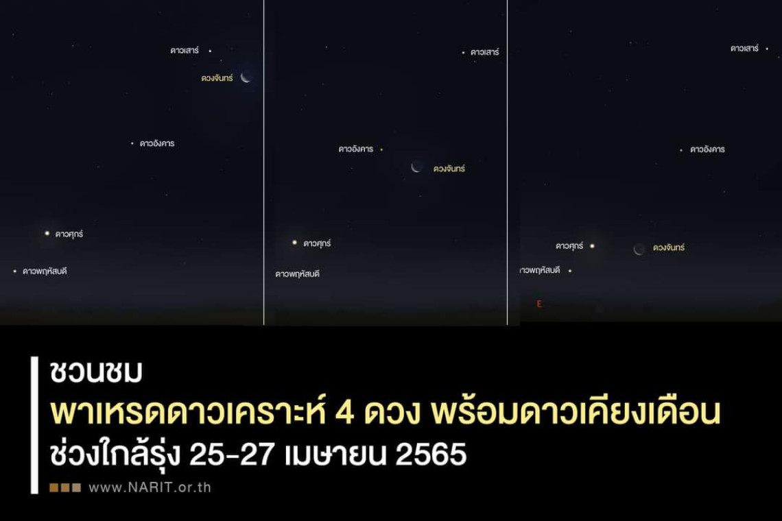 เพจ NARIT สถาบันวิจัยดาราศาสตร์แห่งชาติ โพสต์ผ่านเฟซบุ๊กระบุ ชวนชมพาเหรดดาวเคราะห์ 4 ดวง มาพร้อมกับดาวเคียงเดือน ช่วงใกล้รุ่ง 25-27 เมษายน 2565 พบกับพาเหรดดาวเคราะห์ ดาวเสาร์ ดาวอังคาร ดาวศุกร์ และดาวพฤหัสบดี เรียงกันเหนือท้องฟ้าช่วงเช้ามืด ปรากฏพร้อมกับ “ดาวเคียงเดือน” ตลอด 3 วัน สังเกตได้ด้วยตาเปล่าทุกภูมิภาคทั่วไทย ทางทิศตะวันออก ตั้งแต่เวลาประมาณ 04:00 น. จนถึงรุ่งเช้า