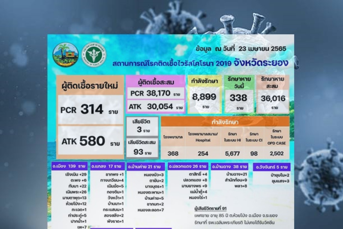 เมื่อวันที่ 23 เม.ย.ศูนย์ปฏิบัติการโควิด-19 ระยอง นายงานสถานการณ์โควิดประจำวัน พบว่าวันนี้มีผู้ป่วยโควิดเสียชีวิต 3 ราย โดยรายแรกเป็นเพศชาย อายุ 85 ปี อยู่ ต.ห้วยโป่ง อ.เมืองระยอง เข้ารับการรักษาตัวที่ ระ.เฉลิมพระเกียรติฯ ระยอง ไม่เคยได้รับวัคซีนต้านโควิด รายที่ 2 เป็นเพศชาย อายุ 91 ปี อยู่ ต.หนองบัว อ.บ้านค่าย มีโรคประจำตัวปอดอุดกั้นเรื้อรัง เข้ารับการรักษาตัวที่ รพ.บ้านค่าย ไม่เคยได้รับวัคซีนต้านโควิด อีกรายเป็นเพศหญิง อายุ 60 ปี อยู่ ต.บ้านฉาง อ.บ้านฉาง โรคประจำตัว หัวใจ แขนขาอ่อนแรง เข้ารับการรักษาตัวที่ รพ.บ้านฉาง ไม่เคยได้รับวัคซีนต้านโควิด รวมเสียชีวิตสะสม 93 ราย พบติดเชื้อรายวัน 314 ราย ยอดติดเชื้อสะสม 38,170 ราย โดยพบผู้ติดเชื้อใน 8 อำเภอ อ.เมืองระยอง 139 ราย อ.นิคมพัฒนา 43 ราย อ.บ้านฉาง 38 ราย อ.ปลวกแดง 26 ราย อ.บ้านค่าย 21 ราย อ.แกลง 17 ราย อ.วังจันทร์ 5 ราย อ.เขาชะเมา 1 ราย มียอดฉีดวัคซีน 2,056,917 เข็ม.