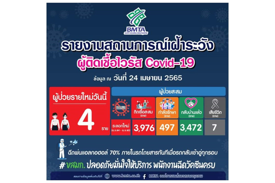 เพจองค์การขนส่งมวลชนกรุงเทพ โพสต์ระบุว่า ประกาศคณะทำงานศูนย์ปฏิบัติการภาวะฉุกเฉินโรคติดเชื้อไวรัส โคโรนา 2019 (COVID - 19) ประจำวันที่ 24 เมษายน 2565 พบพนักงานติดเชื้อฯ จำนวน 17 ราย ติดเชื้อสะสม 3,976 ราย กำลังรักษา 497 ราย กลับบ้านแล้ว 3,4272ราย เสียชีวิตสะสม 7 ราย