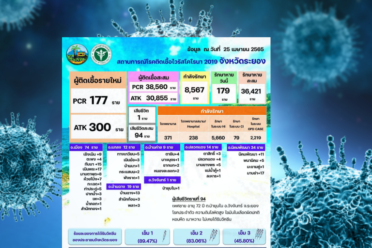 เมื่อวันที่ 25 เม.ย.65 ศูนย์ปฏิบัติการฯ โควิด-19 ระยอง รายงานสถานการณ์ผู้ติดเชื้อประจำวัน วันนี้พบผู้ติดเชื้อเสียเพิ่ม 1 ราย เป็นเพศชาย อายุ 72 ปี อยู่ ต.ป่ายุบใน อ.วังจันทร์ มีโรคประจำตัว ความดันโลหิตสูง ไขมันในเลือดผิดปกติ หอบหืด เบาหวาน ไม่เคยได้รับวัคซีน ส่วนผู้ติดเชื้อพบเพิ่ม 177 ราย เสียชีวิตสะสม 94 ราย ผู้ติดเชื้อสะสมละลอกใหม่เพิ่มเป็น 38,560 ราย โดยพบผู้ติดเชื้อใน 7 อำเภอ โดยพบสูงสุดอยู่ใน อ.เมืองระยอง 74 ราย รองลงมามี อ.นิคมพัฒนา 34 ราย อ.บ้านฉาง 19 ราย อ.ปลวกแดง 14 ราย อ.แกลง 12 ราย อ.บ้านค่าย 9 ราย อ.วังจันทร์ 1 ราย ยอดฉีดวัคซีนจังหวัดระยอง 2,064,794 เข็ม.