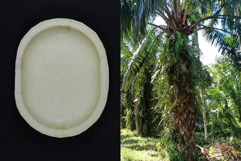 สำหรับการศึกษาสภาวะที่เหมาะสมต่อการผลิตเยื่อกระดาษกึ่งเคมีสำหรับบรรจุภัณฑ์จาน พบว่าเยื่อปาล์มน้ำมันจะต้มในสารละลายโซเดียมไฮดรอกไซด์ (NaOH ) ความเข้มข้น 8% ที่อุณหภูมิ 100 องศาเซลเซียส เป็นเวลา 30 นาที แล้วทำการฟอกเยื่อด้วยสารละลาย H2O2 ความเข้มข้น 8% ที่อุณหภูมิ 100 องศาเซลเซียส เป็นเวลา 30 นาที แล้วผสมสารละลายแป้งข้าวโพดความเข้มข้น 1% จากนั้นนำแผ่นเยื่อกระดาษที่ได้ไปทำการอัดขึ้นรูปด้วยความร้อนที่อุณหภูมิ 150 องศาเซลเซียส เป็นเวลา 5 นาที ภายใต้ความดัน 100 psi โดยบรรจุภัณฑ์จานที่ได้มีความสามารถในการต้านการซึมน้ำ 1 นาที 97 วินาที ต้านต่อแรงดันทิ่มทะลุ 517.52 J และการการยืดตัวเพียง 2.58% แม้คุณสมบัติโดยรวมของจานจากลำต้นปาล์มน้ำมันยังด้อยกว่าชานอ้อย แต่มีน้ำหนักเบากว่า สามารถพัฒนาแข่งขันกับชานอ้อยได้