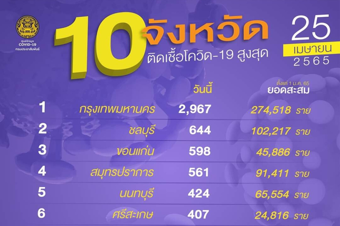 25 เม.ย.2565 ศูนย์ข้อมูลโควิด-19 รายงานสถานการณ์โรคติดเชื้อไวรัสโควิด-19 ข้อมูล ณ วันที่ 25 เม.ย.65 เวลา 01.00 น. ยังคงพบผู้ติดเชื้อรายใหม่ใน 76 จังหวัด ยกเว้น จังหวัดลำพูน วันนี้ไม่พบผู้ติดเขื้อรายใหม่ โดย 10 อันดับจังหวัดติดเชื้อสูงสุด พบว่ากทม.ยังคงมีผู้ติดเชื้อรายใหม่อยู่ในอันดับ 1 อยู่ที่ 2,967 ราย ลดลงจากเมื่อวาน (จาก 3,200 ราย) อันดับ 2 ชลบุรี 644 ราย (จาก 608 ราย) อันดับ 3 ขอนแก่น 598 ราย (จาก 767 ราย) อันดับ 4 สมุทรปราการ 561 ราย (จาก 686 ราย) อันดับ 5 นนทบุรี 425 ราย (จาก 519 ราย) อันดับ 6 ศรีษะเกษ 407 ราย(จาก 443 ราย) อันดับ 7 นครศรีธรรมราช 371 ราย (จาก 352 ราย) อันดับ 8 ร้อยเอ็ด 360 ราย (จาก 404 ราย) อันดับ 9 นครราชสีมา 348 ราย (จาก 341 ราย) และอันดับ 10 บุรีรัมย์ 339 ราย(จาก 447 ราย)