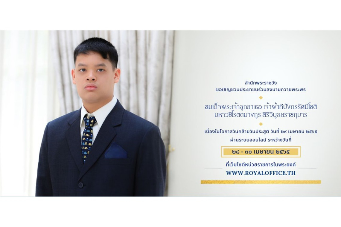 สำนักพระราชวัง ขอเชิญชวนประชาชนร่วมลงนามถวายพระพร สมเด็จพระเจ้าลูกยาเธอ เจ้าฟ้าทีปังกรรัศมีโชติ มหาวชิโรตตมางกูร สิริวิบูลยราชกุมาร เนื่องในโอกาสวันคล้ายวันประสูติ วันที่ 29 เมษายน 2565 ผ่านระบบออนไลน์ ที่เว็บไซต์หน่วยราชการในพระองค์ www.royaloffice.th ระหว่างวันที่ 28-30 เมษายน 2565