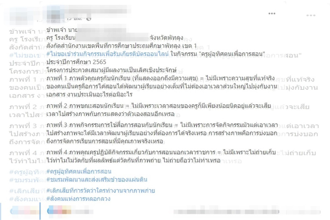 "ข้าพเจ้า นาย ... ครู โรงเรียน ... จังหวัดพัทลุง สังกัดสำนักงานเขตพื้นที่การศึกษาประถมศึกษาพัทลุง เขต 1 #ไม่ขอเข้าร่วมกิจกรรมเพื่อรับเกียรติบัตรออนไลน์ ในกิจกรรม "ครูผู้อุทิศตนเพื่อการสอน" ประจำปีการศึกษา 2565 โครงการประกวดเสมาผู้มีผลงานเป็นเลิศเชิงประจักษ์