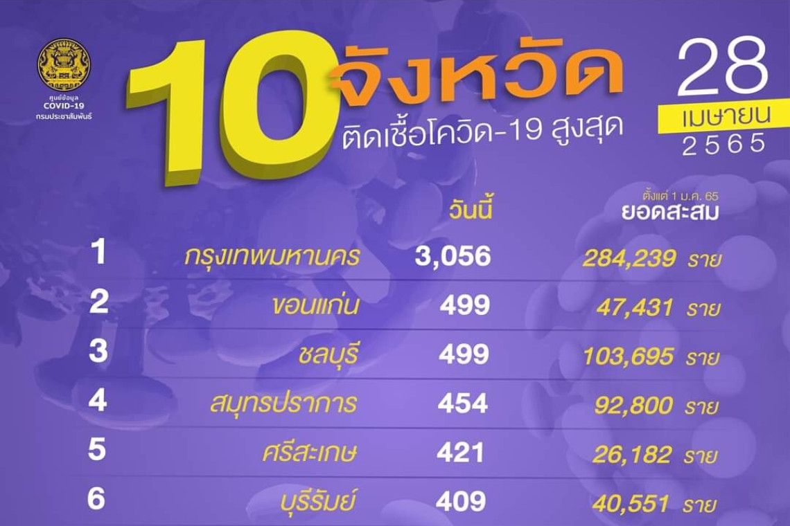 28 เม.ย.2565 ศูนย์ข้อมูลโควิด-19 รายงานสถานการณ์โรคติดเชื้อไวรัสโควิด-19 ข้อมูล ณ วันที่ 28 เม.ย.65 เวลา 01.00 น. พบผู้ติดเชื้อรายใหม่ยกประเทศ 77 จังหวัด จังหวัดลำพูน วันนี้พบผู้ติดเชื้อรายใหม่ เข้ามา 1 ราย โดย 10 อันดับจังหวัดติดเชื้อสูงสุด พบว่ากทม.ยังคงมีผู้ติดเชื้อรายใหม่อยู่ในอันดับ 1 อยู่ที่ 3,056 ราย ลดลงจากเมื่อวาน (จาก 3,292 ราย) เช่นเดียวกับ อันดับ 2 ขอนแก่น 499 ราย (จาก 687 ราย) อันดับ 3 ชลบุรี 499 ราย (จาก 533 ราย) อันดับ 5 ศรีษะเกษ 421 ราย (จาก 610 ราย) อันดับ 6 บุรีรัมย์ 409 ราย (จาก 537 ราย) อันดับ 8 อุบลราชธานี 299 ราย (จาก 336 ราย)