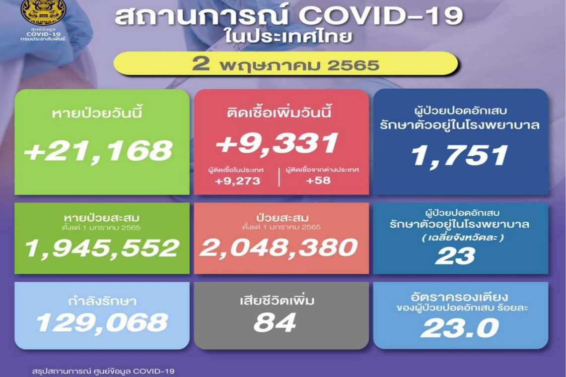 วันที่ 2 พ.ค.2565 ศูนย์ข้อมูล COVID-19 รายงานยอดผู้ติดเชื้อโควิด-19 รายใหม่จำนวน 9,331 ราย จำแนกเป็น ติดเชื้อในประเทศ 9,273 ราย ติดเชื้อจากต่างประเทศ 58 ราย ทำให้ยอดผู้ป่วยสะสมตั้งแต่ 1 มกราคม 2565 มีจำนวน 2,048,380 ราย