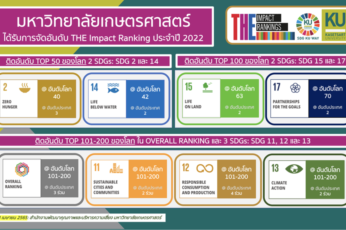 เมื่อวันที่ 28 เมษายน 2565 The Times Higher Education (THE) ซึ่งเป็นสถาบันจัดอันดับมหาวิทยาลัยของโลก จากประเทศอังกฤษ ประกาศผล The Times Higher Education Impact Rankings 2022 การจัดอันดับมหาวิทยาลัยที่มีการดำเนินงานสนับสนุน #SDGs ตามเกณฑ์การพัฒนาความยั่งยืนขององค์กรเพื่อสังคม 17 กลุ่ม ของสหประชาชาติ (United Nations: Sustainable Development Goals) หรือ UN: SDGs ซึ่งในปีนี้จัดขึ้นเป็นปีที่ 4 มีจำนวนมหาวิทยาลัยที่ได้รับการจัดอันดับรวม หรือ overall ranking 1,406 แห่งใน 106 ประเทศทั่วโลก เป็นมหาวิทยาลัยในประเทศไทยจำนวน 51 แห่ง ซึ่งเพิ่มขึ้นจากปี 2021 ถึง 25 แห่ง (ปี 2021 มีจำนวน 26 แห่ง, ปี 2020 มีจำนวน 19 แห่ง) และมหาวิทยาลัยเกษตรศาสตร์ เข้าร่วมการจัดอันดับเป็นปีที่ 2 สะท้อนได้ว่ามหาวิทยาลัยในประเทศไทยมีการตื่นตัวและขับเคลื่อนเป้าหมายการพัฒนาที่ยั่งยืนของภาคการศึกษาและมีบทบาทในการทำงานเพื่อสังคมอย่างเป็นที่ประจักษ์มากขึ้น