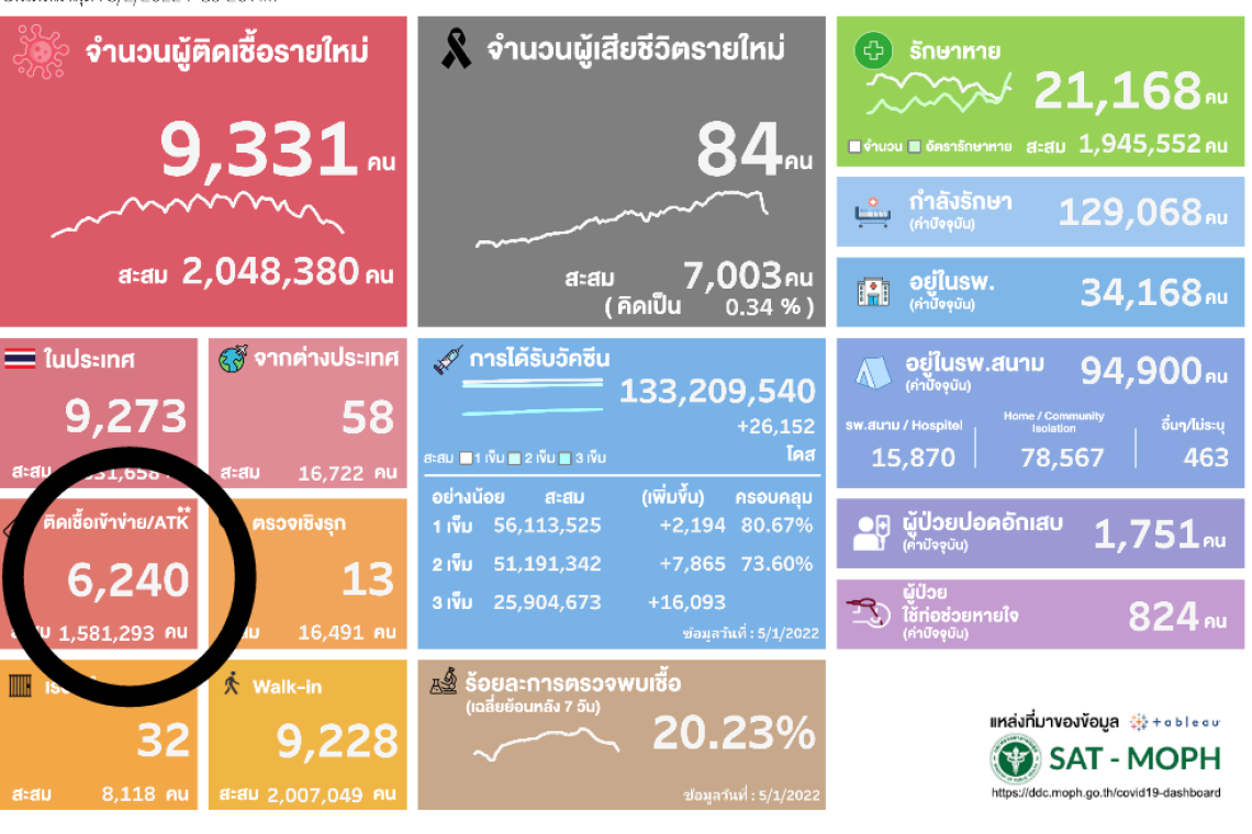 ข้อมูลกรมควบคุมโรค กระทรวงสาธารณสุข รายงานวันที่ 2 พ.ค.65 พบผู้ติดเชื้อรายใหม่ 9,273 ราย โดยพบผลตรวจ ATK เพิ่มอีก 6,240 ราย (ลดลงจากเมื่อวาน 9,924)รวมผลตรวจ ATK สะสมจำนวน 1,581,293 ราย โดยเมื่อรวมผลตรวจ ATK แล้วจะทำให้จำนวนผู้ติดเชื้อรายใหม่อยู่ที่ 15,571 ราย ส่วนผู้เสียชีวิตวันนี้ลดลง 84 ราย (จากเมื่อวาน 91 ราย)