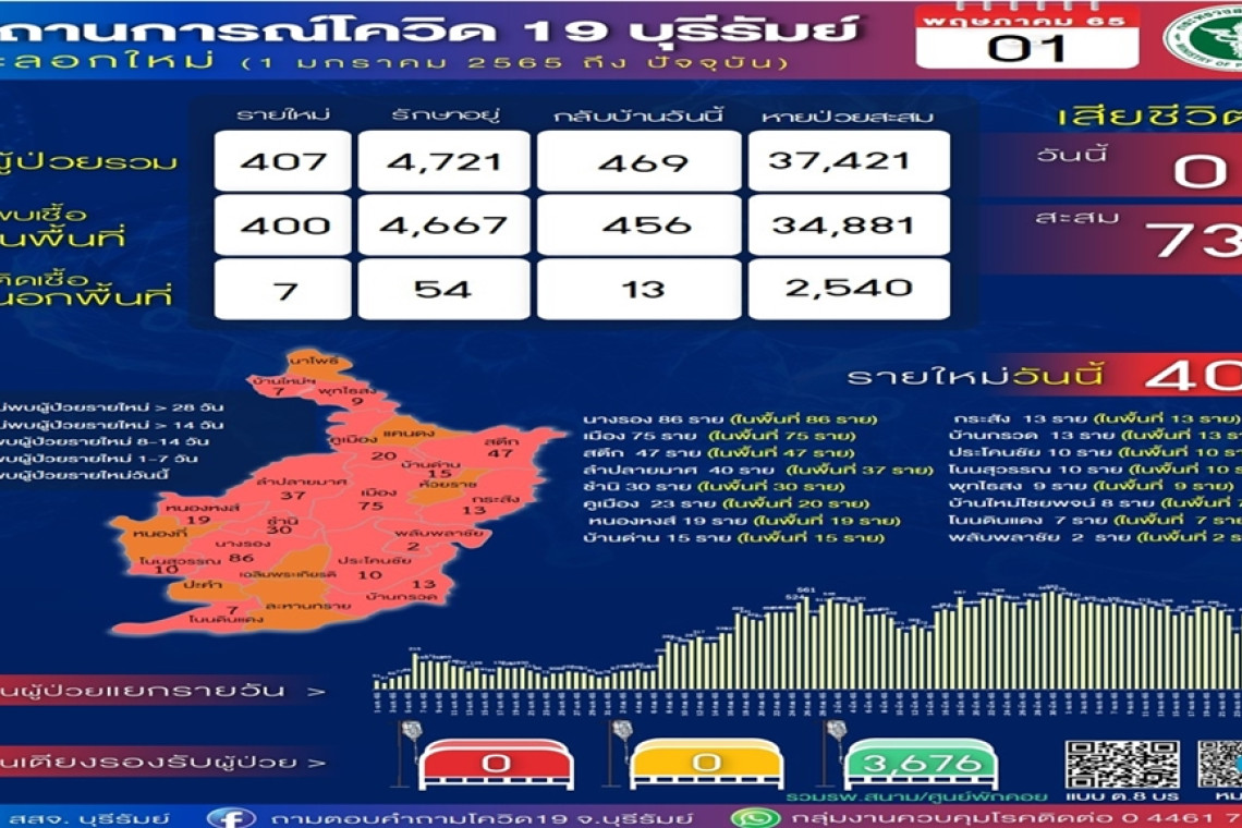 วันที่ 2 พ.ค.65 สำนักงานสาธารณสุขจังหวัดบุรีรัมย์ ได้รายงานข้อมูลสถานการณ์แพร่ระบาดของโรคติดเชื้อไวรัสโควิด-19 ในพื้นที่ จ.บุรีรัมย์ ระลอกใหม่ ตั้งแต่วันที่ 1 ม.ค.65 ถึงวันที่ 1 พ.ค.65 ว่า วันนี้ พบผู้ป่วยยืนยันติดเชื้อโควิด-19 รายใหม่ จำนวน 407 ราย ซึ่งวันนี้พบผู้ป่วยมากเป็นอันดับสองของประเทศ ติดต่อกันเป็นวันที่สอง รองจากกรุงเทพมหานคร ไม่มีผู้เสียชีวิต โดยพบติดเชื้อในพื้นที่จังหวัด 400 ราย และติดเชื้อจากนอกพื้นที่ 7 ราย ซึ่งติดเชื้อมาจากจังหวัดเสี่ยงทั้งหมด รวมยอดผู้ป่วยสะสมติดเชื้อโควิด-19 ระลอกมกราคม 42,215 ราย มีผู้เสียชีวิตสะสม 73 ราย หายป่วยสะสม 37,421 ราย กลับบ้านวันนี้ 469 ราย และยังรักษาอยู่ 4,721 ราย กระจายตามโรงพยาบาลต่างๆ ในพื้นที่จังหวัด