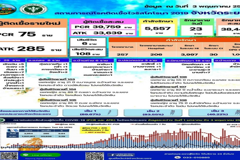 วันที่ 3 พ.ค.65 ศูนย์ปฏิบัติการฯ โควิด-19 ระยอง รายงานสถานการณ์ผู้ติดเชื้อประจำวัน วันนี้พบผู้ติดเชื้อเสียเพิ่ม 6 ราย รายแรก เป็นเพศชาย อายุ 21 ปี อยู่ ต.บางบุตร อ.บ้านค่าย มีโรคประจำตัว ดาวน์ซินโดรม ไม่เคยได้รับวัคซีน รายที่ 2 เป็นเพศหญิง อายุ 89 ปี มีโรคประจำตัว เป็นโรคเลือด ไม่เคยได้รับวัคซีน รายที่ 3 เป็นเพศหญิง อายุ 85 ปี อยู่ ต.เพ อ.เมืองระยอง มีโรคประจำตัวจิตเวช ไม่เคยได้รับวัคซีน รายที่ 4 เป็นเพศชาย อายุ 55 ปี อยู่ ต.ทางเกวียน อ.แกลง ไม่เคยได้รับวัคซีน รายที่ 5 เป็นเพศชาย อายุ 82 ปี อยู่ ต.น้ำเป็น อ.เขาชะเมา มีโรคประจำตัว ความดันโลหิตสูง ไขมันในเลือดผิดปกติ เบาหวาน ไม่เคยได้รับวัคซีน และรายที่ 6 เป็นเพศหญิง อายุ 75 ปี อยู่ ต.สำนักท้อน อ.บ้านฉาง มีโรคประจำตัว ไขมัน ไม่เคยได้รับวัคซีน