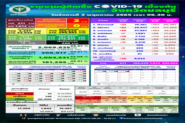 วันที่ 3 พ.ค.65 สสจ.ชลบุรี มีรายงานผู้ติดเชื้อโควิด-19 ยืนยันรายใหม่ RT-PCR จำนวน 271 ราย ผู้เข้าข่ายติดเชื้อโควิด-19 ATK 1,674 ราย เสียชีวิต 2 ราย