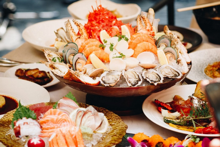 โดยสามารถลิ้มรสอาหารนานาชาติแบบบุฟเฟ่ต์ ที่คัดสรรเมนูอาหารจานเด่นจากทุกห้องอาหารของโรงแรมฯ มารวมไว้ในมื้อเดียว อาทิ ฟัวกราส์ ล็อบสเตอร์ หอยนางรม ซีฟู้ด อาหารยุโรป และสเต๊กเนื้อนำเข้าจากห้องอาหารเมดิสัน สเต๊กเฮ้าส์ เทมปุระ ซูชิ ซาชิมิ ปลาดิบนำเข้าจากญี่ปุ่น ราเมงเนื้อวากิว จากห้องอาหารชินทาโร่ พาสต้า รีซอตโต ตำรับอิตาเลียน จากห้องอาหารบิสก็อตติ อาหารจีน อาทิ เป็ดปักกิ่ง หมูแดง รวมทั้งโคลด์คัท ชีส และอาหารอินเดีย เป็นต้น