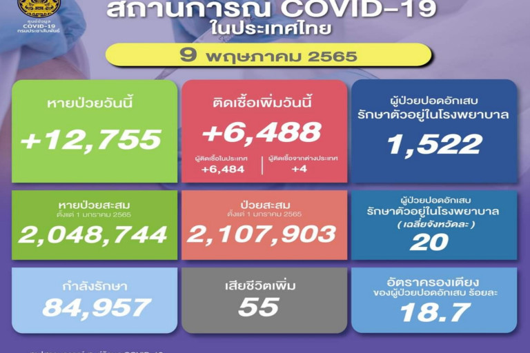 วันที่ 9 พ.ค.2565 ศูนย์ข้อมูล COVID-19 รายงานยอดผู้ติดเชื้อโควิด-19 รายใหม่จำนวน 6,488 ราย จำแนกเป็น ติดเชื้อในประเทศ 6,484 ราย ติดเชื้อจากต่างประเทศ 4 ราย ทำให้ยอดผู้ป่วยสะสมตั้งแต่ 1 มกราคม 2565 มีจำนวน 2,107,903 ราย