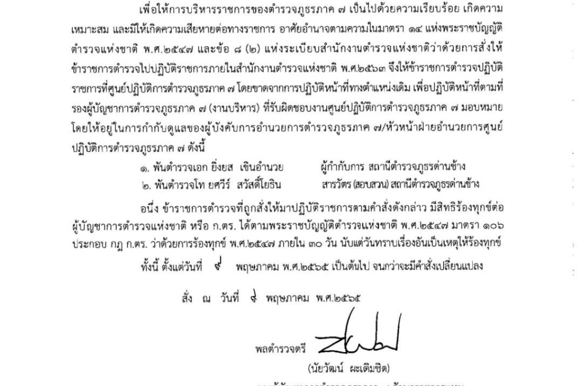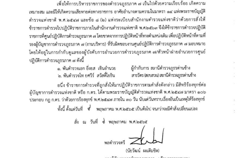 วันที่ 9 พ.ค. ที่ บช.ภ..7 พล.ต.ต.นัยวัฒน์ ผะเดิมซิต รองผู้บัญชาการตำรวจภูธรภาค 7 รักษาราชการแทนผู้บัญชาการตำรวจภูธรภาค ลงคำสั่งตำรวจภูธรภาค 7 ที่ 286 /2565 เรื่อง ให้ข้าราชการตำรวจปฏิบัติราชการ เพื่อให้การบริหารราชการของตำรวจภูธรภาค 7 เป็นไปด้วยความเรียบร้อย เกิดความเหมาะสม และมิให้เกิดความเสียหายต่อทางราชการ อาศัยอำนาจตามความในมาตรา 14 แห่งพระราชบัญญัติตำรวจแห่งชาติ พ.ศ.2547และข้อ 8 (2) แห่งระเบียบสำนักงานตำรวจแห่งชาติว่าด้วยการสั่งให้ข้าราชการตำรวจไปปฏิบัติราชการภายในสำนักงานตำรวจแห่งชาติ พ.ศ.2563 จึงให้ช้าราชการตำรวจปฏิบัติราชการที่ศูนย์ปฏิบัติการตำรวจภูธรภาค 7 โดยขาดจากการปฏิบัติหน้าที่ทางตำแหน่งเดิม เพื่อปฏิบัติหน้าที่ตามที่รองผู้บัญชาการตำรวจภูธรภาค 7 (งานบริหาร) ที่รับผิดชอบงานศูนย์ปฏิบัติการตำรวจภูธรภาค 7 มอบหมายโดยให้อยู่ในการกำกับดูแลของผู้บังคับการอำนวยการตำรวจภูธรภาค 7/หัวหน้าฝ่ายอำนวยการศูนย์ปฏิบัติการตำรวจภูธรภาค 7 ดังนี้ 1.พ.ต.อ. ยิ่งยส เขินอำนวย ผู้กำกับการ สถานีตำรวจภูธรด่านช้าง 2.พ.ต.ท.ยศวีร์ สวัสดิ์โยธิน สารวัตร (สอบสวน) สถานีตำรวจภูธรด่านช้าง
