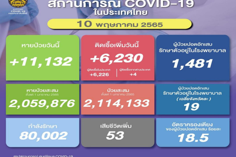 วันที่ 10 พ.ค.2565 ศูนย์ข้อมูล COVID-19 รายงานยอดผู้ติดเชื้อโควิด-19 รายใหม่จำนวน 6,230 ราย จำแนกเป็น ติดเชื้อในประเทศ 6,226 ราย ติดเชื้อจากต่างประเทศ 4 ราย ทำให้ยอดผู้ป่วยสะสมตั้งแต่ 1 มกราคม 2565 มีจำนวน 2,114,133 ราย