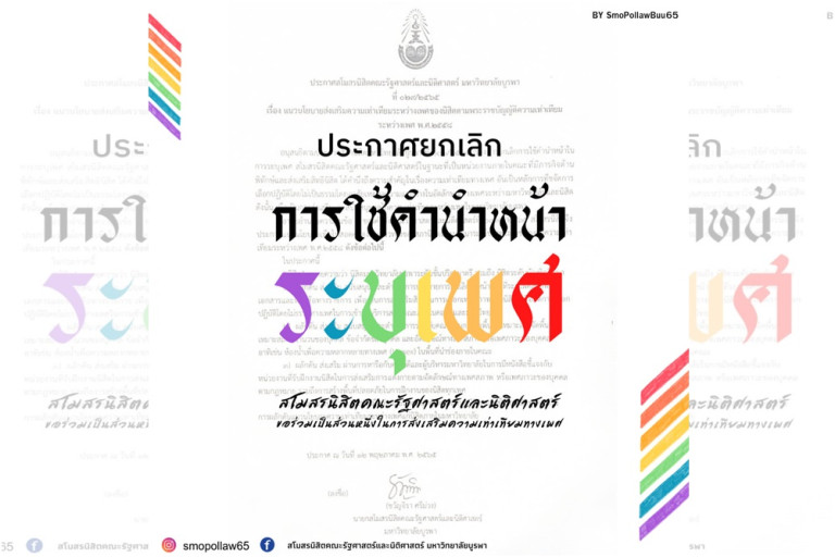 ทางสโมสรนิสิตคณะรัฐศาสตร์และนิติศาสตร์ ขอร่วมเป็นส่วนหนึ่งในการส่งเสริมความเท่าเทียมทางเพศ จึงขอประกาศยกเลิกการใช้คำนำหน้าระบุเพศ ตามประกาศที่ 029/2565 ตั้งเเต่วันนี้เป็นต้นไป