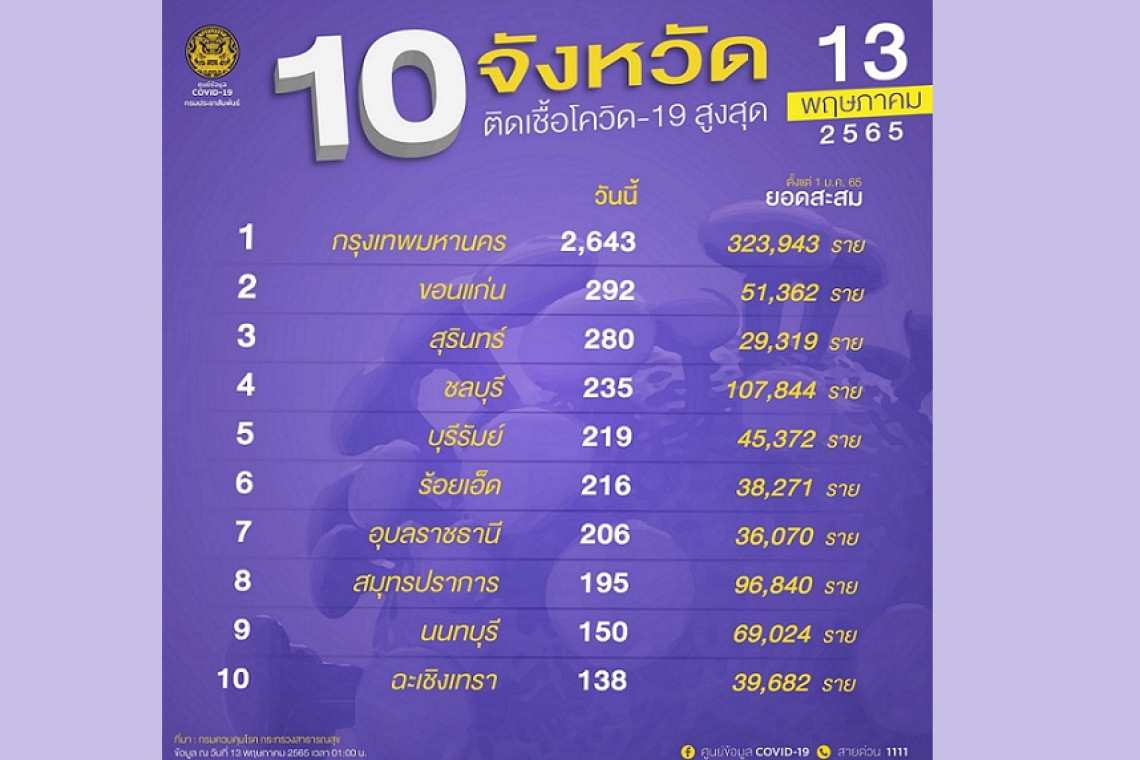 วันที่ 13 พ.ค. 2565 – ศูนย์ข้อมูล COVID-19 รายงานว่า 10 อันดับจังหวัดที่มีจำนวนผู้ติดเชื้อโควิด-19 ในประเทศรายใหม่สูงสุด ได้แก่ 1.กรุงเทพมหานคร 2,643 ราย 2.ขอนแก่น 292 ราย 3.สุรินทร์ 280 ราย 4.ชลบุรี 235 ราย 5.บุรีรัมย์ 219 ราย 6.ร้อยเอ็ด 216 ราย 7.อุบลราชธานี 206 ราย 8.สมุทรปราการ 195 ราย 9.นนทบุรี 150 ราย และ 10.ฉะเชิงเทรา.