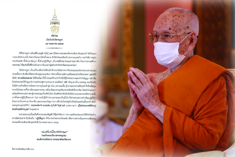 เพจสำนักงานเลขานุการสมเด็จพระสังฆราช โพสต์ข้อความผ่านเฟซบุ๊ก เนื่องในวันวิสาขบูชา ๑๕ พฤษภาคม ๒๕๖๕ เจ้าพระคุณ สมเด็จพระอริยวงศาคตญาณ สมเด็จพระสังฆราช สกลมหาสังฆปริณายก ประทานพระคติธรรม ความว่า