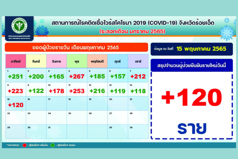ร้อยเอ็ดติดเชื้อรายใหม่ 120 ราย บุคลากรทางการแพทย์ 6 ราย ใน 15อำเภอ มีเสียชีวิต 3 ราย เสียชีวิตสะสม 200 ราย