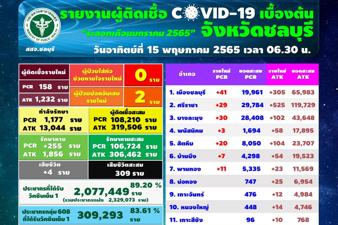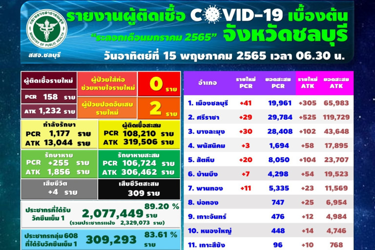 วันนี้ (15 พ.ค.65) สสจ.ชลบุรี มีรายงานพบผู้ติดเชื้อโควิด 19 รายใหม่ จากผลตรวจ RT-PCR และผลตรวจ ATK รวม 1,390 ราย มีผู้ป่วยปอดอักเสบ 2 รายอ.เมืองชลบุรี ติดเชื้อสูงสุด 41 ราย รวมผู้ติดเชื้อสะสมระลอกใหม่ จากผลตรวจ RT-PCR (108,210) และจากผลตรวจ ATK (319,506) รวม 427,716 รายรักษาหายสะสมแล้ว จำนวน 413,186 ราย ยังคงรักษาตัวอยู่ จำนวน 14,221 ราย