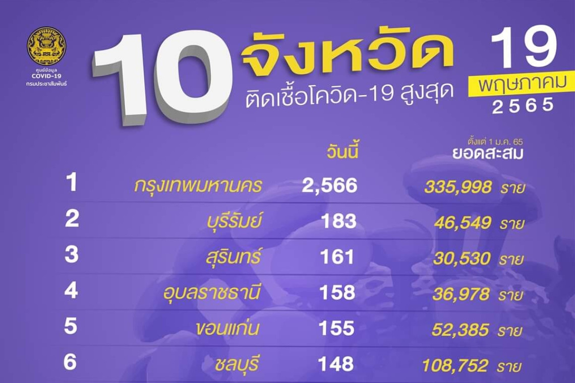 19 พ.ค.2565 ศูนย์ข้อมูลโควิด-19 รายงานสถานการณ์โรคติดเชื้อไวรัสโควิด-19 ข้อมูล ณ วันที่ 19 พ.ค.65 เวลา 01.00 น. พบผู้ติดเชื้อรายใหม่ 76 จังหวัด มีเพียงจังหวัดลำปาง เท่านั้นที่วันนี้ไม่พบผู้ติดเชื้อรายใหม่ โดย 10 อันดับจังหวัดติดเชื้อสูงสุด พบว่ากทม.ยังคงมีผู้ติดเชื้อรายใหม่อยู่ในอันดับ 1 อยู่ที่ 2,566 ราย เพิ่มจากเมื่อวาน (จาก 2,488 ราย) อันดับ 2 บุรีรัมย์ 183 ราย (จาก 187 ราย)อันดับ 3 สุรินทร์ 161 ราย (จาก 204 ราย) อันดับ 4 อุบลราชธานี 158 ราย (จาก 161 ราย) อันดับ 5 ขอนแก่น 155 ราย (จาก 180 ราย) อันดับ 6 ชลบุรี 148 ราย (จาก 113 ราย) อันดับ 7 มหาสารคาม 146 ราย (จาก ราย) อันดับ 8 ชัยภูมิ 127 ราย (จาก 77 ราย) อันดับ 9 ร้อยเอ็ด 110 ราย (จาก 109 ราย) อันดับ 10 กาฬสินธุ์ 110 ราย (จาก 57) ราย)