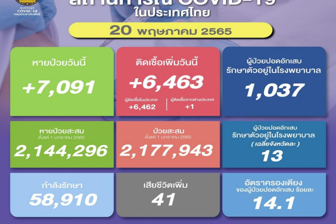 วันที่ 20 พ.ค.2565 ศูนย์ข้อมูล COVID-19 รายงานยอดผู้ติดเชื้อโควิด-19 รายใหม่จำนวน 6,463 ราย จำแนกเป็น ติดเชื้อในประเทศ 6,462 ราย ติดเชื้อจากต่างประเทศ 1 ราย ทำให้ยอดผู้ป่วยสะสมตั้งแต่ 1 มกราคม 2565 มีจำนวน 2,177,943 ราย
