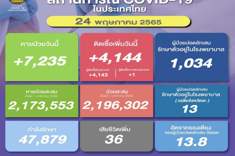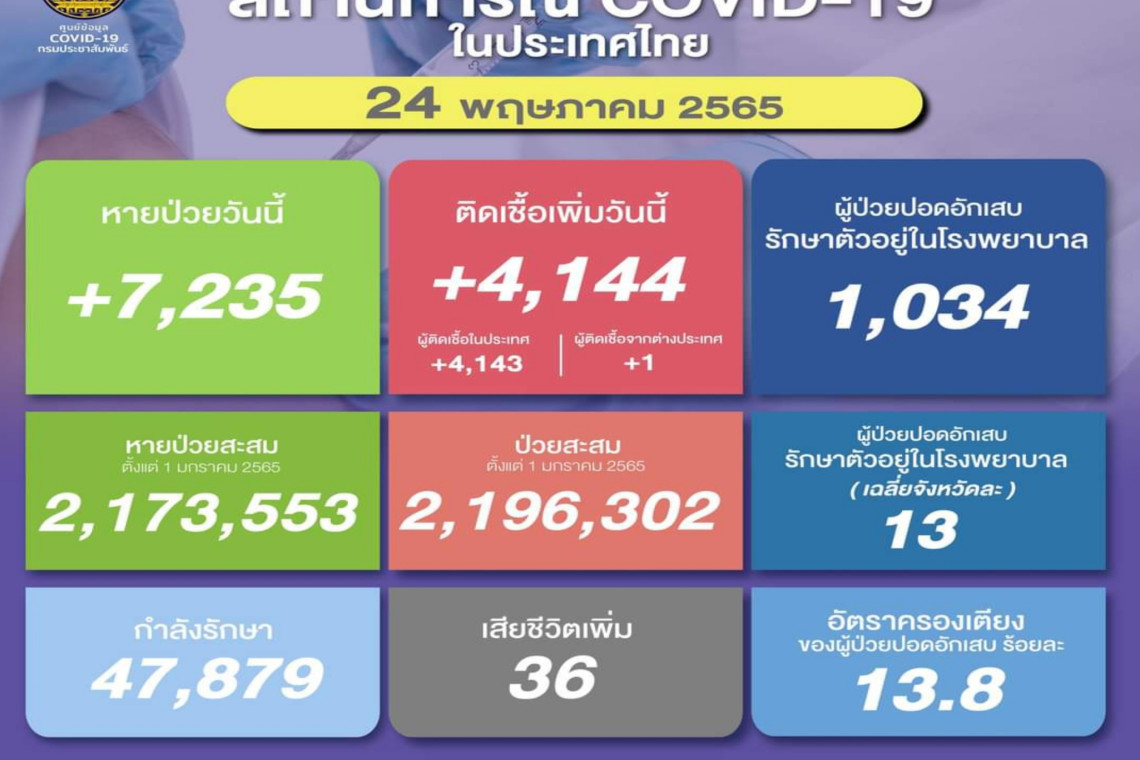 วันที่ 24 พ.ค.2565 ศูนย์ข้อมูล COVID-19 รายงานยอดผู้ติดเชื้อโควิด-19 รายใหม่จำนวน 4,144 ราย จำแนกเป็นติดเชื้อในประเทศ 4,143 ราย ติดเชื้อจากต่างประเทศ 1 ราย ทำให้ยอดผู้ป่วยสะสมตั้งแต่ 1 มกราคม 2565 มีจำนวน 2,196,303 ราย