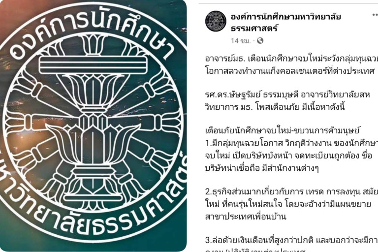 เพจเฟสบุ๊คองค์กรนักศึกษามหาวิทยาลัยธรรมศาสตร์ได้โพสต์เตือนนักศึกษาว่า อาจารย์มธ. เตือนนักศึกษาจบใหม่ระวังกลุ่มทุนฉวยโอกาสลวงทำงานแก็งคอลเซนเตอร์ที่ต่างประเทศ