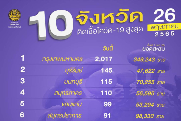 วันที่ 26 พ.ค.2565 ศูนย์ข้อมูลโควิด-19 รายงานสถานการณ์โรคติดเชื้อไวรัสโควิด-19 ข้อมูล ณ วันที่ 26 พ.ค.65 เวลา 01.00 น. พบผู้ติดเชื้อรายใหม่ 74 จังหวัด มีเพียงจังหวัด ลำปาง ลำพูน และพังงา ที่วันนี้ไม่พบผู้ติดเชื้อรายใหม่ โดย 10 อันดับจังหวัดติดเชื้อสูงสุด พบว่ากทม.ยังคงมีผู้ติดเชื้อรายใหม่อยู่ในอันดับ 1 อยู่ที่ 2,017 ราย เพิ่มขึ้นจากเมื่อวาน (จาก 2,001 ราย) อันดับ 2 บุรีรัมย์ 145 ราย (จาก 150 ราย) อันดับ 3 นนทบุรี 115 ราย (จาก 78 ราย) อันดับ 4 สมุทรสาคร 110 ราย (จาก 105 ราย) อันดับ 5 ขอนแก่น 99 ราย (จาก 135 ราย) อันดับ 6 สมุทรปราการ 91 ราย (จาก 97 ราย) อันดับ 7 ชลบุรี 88 ราย (จาก 136 ราย) อันดับ 8 สกลนคร 88 ราย (จาก 73 ราย) อันดับ 9 ร้อยเอ็ด 86 ราย (จาก 89 ราย) อันดับ 10 นครพนม 86 ราย (จาก 72 ราย)