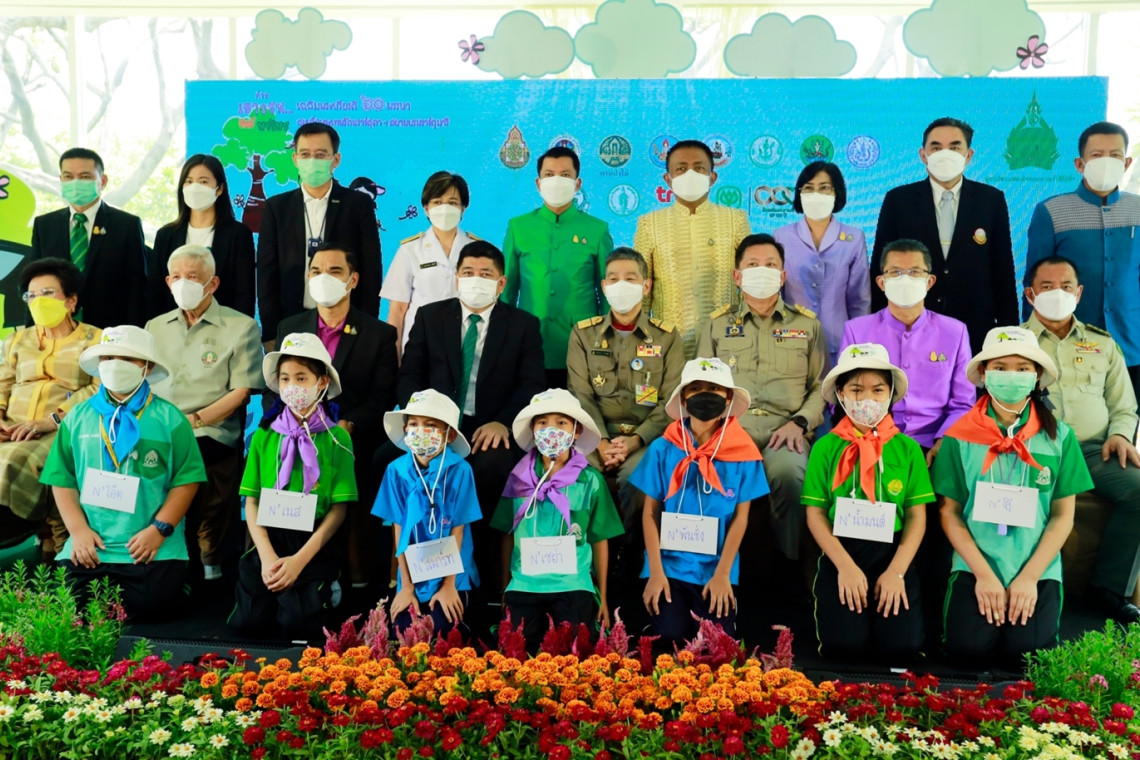 ดร.จรัลธาดา กรรณสูต องคมนตรี และประธานกรรมการ มูลนิธิสวนสมเด็จพระนางเจ้าสิริกิติ์ฯ (แถวนั่งที่ 4 จากขวา) เป็นประธานเปิดโครงการ “ค่ายเยาวชน…รักษ์พงไพร เฉลิมพระเกียรติ 60 พรรษา สมเด็จพระเทพรัตนราชสุดาฯ สยามบรมราชกุมารี” ประจำปี 2565 ซึ่งมูลนิธิสวนสมเด็จพระนางเจ้าสิริกิติ์ฯ พร้อมด้วย 13 องค์กรภาครัฐ อาทิ สำนักงานคณะกรรมการการศึกษา ขั้นพื้นฐาน กระทรวงศึกษาธิการ กระทรวงทรัพยากรธรรมชาติและสิ่งแวดล้อม กระทรวงเกษตรและสหกรณ์ กรุงเทพมหานคร และภาคเอกชน ได้แก่ เครือเจริญโภคภัณฑ์ โดย นางสาววรัญญา ธนะเพทย์ ผู้จัดการ ด้านพัฒนาความยั่งยืนภาครัฐและกิจการสัมพันธ์ (แถวยืนที่ 2 จากซ้าย) และกลุ่มทรู โดย นายประพาฬพงษ์ มากนวล รองผู้อำนวยการ ฝ่ายกิจกรรมองค์กรเพื่อสังคม (แถวยืนที่ 3 จากซ้าย) ร่วมกันจัดขึ้น ณ ศูนย์ศึกษาธรรมชาติและสัตว์ป่า ของกรมอุทยานแห่งชาติฯ และศูนย์การเรียนรู้เพื่อการอนุรักษ์ทรัพยากรป่าไม้ตามแนวพระราชดำริ ของกรมป่าไม้ รวม 32 แห่งทั่วประเทศ ซึ่งในปีนี้ได้มีการเพิ่มศูนย์การเรียนรู้ใหม่จำนวน 1 ศูนย์ ณ โครงการชั่งหัวมัน ตามพระราชดำริ (พ.ศ. 2552) ตำบล เขากระปุก อำเภอท่ายาง จังหวัดเพชรบุรี