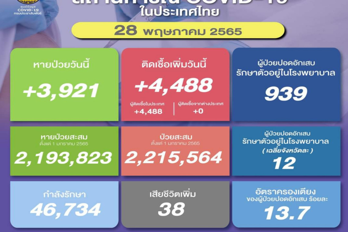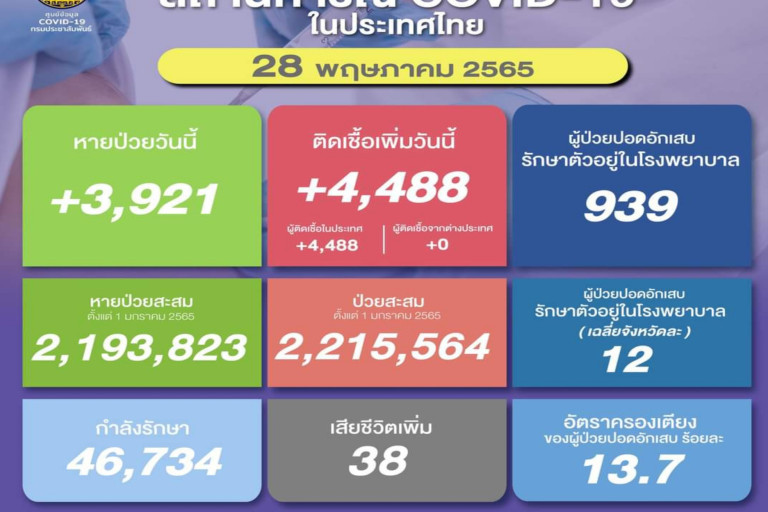 วันที่ 28 พ.ค.2565 ศูนย์ข้อมูล COVID-19 รายงานยอดผู้ติดเชื้อโควิด-19 รายใหม่จำนวน 4,488 ราย จำแนกเป็นติดเชื้อในประเทศ 4,488 ราย ติดเชื้อจากต่างประเทศ 0 ราย ทำให้ยอดผู้ป่วยสะสมตั้งแต่ 1 มกราคม 2565 มีจำนวน 2,215,564 ราย