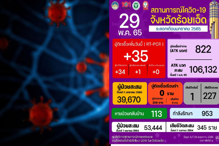 ผู้สื่อข่าวรายงานว่า นายแพทย์ปิติ ทั้งไพศาล นพ.สสจ.ร้อยเอ็ด มอบหมายให้ จนท.รายงานสถานการณ์ไวรัสโคโรนา 2019 โควิด-19 จังหวัดร้อยเอ็ด ประจำวันที่ 29 พฤษภาคม 2565 ดังนี้ ผู้ติดเชื้อรายใหม่ วันนี้ (ระลอก มกราคม 2565)ใน 15 อำเภอจาก 20 อำเภอ 35 ราย ผู้ป่วยสะสม 39,670 รายรักษาหาย 113 ราย คงพยาบาล 953 ราย เสียชีวิต 1 ราย เสียชีวิตสะสม 227 ราย ยอดผู้ป่วยโควิด 19