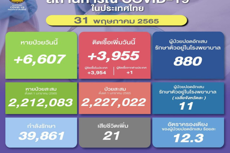 วันที่ 31 พ.ค.2565 ศูนย์ข้อมูล COVID-19 รายงานยอดผู้ติดเชื้อโควิด-19 รายใหม่จำนวน 3,955 ราย จำแนกเป็นติดเชื้อในประเทศ 3,954 ราย ติดเชื้อจากต่างประเทศ 1 ราย ทำให้ยอดผู้ป่วยสะสมตั้งแต่ 1 มกราคม 2565 มีจำนวน 2,227,022 ราย