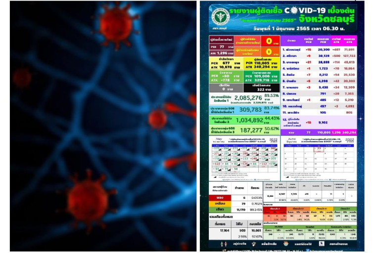 วันที่ 1 มิ.ย.65 สสจ.ชลบุรี มีรายงานผู้ติดเชื้อโควิด-19 ยืนยันรายใหม่ RT-PCR เพียง 77 ราย ไม่มีผู้เสียชีวิต ไม่มีผู้ป่วยใส่ช่วยท่อหายใจ และไม่มีผู้ป่วยปอดอักเสบ ขณะที่ อ.บางละมุง ติดเชื้อสูงสุด 21 ราย ประชากรทั่วไปได้รับวัคซีนเข็ม 1 แล้ว 89.53% รับวัคซีนเข็ม 3 แล้ว 44.43% ส่วนประชากรกลุ่ม 608 รับวัคซีนเข็ม 1 แล้ว 83.74% รับวัคซีนเข็ม 3 แล้ว 50.62% เสียชีวิตสะสมระลอกใหม่ตั้งแต่ ม.ค.65 รวม 322 ราย