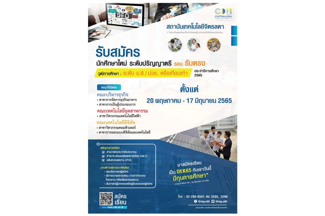สถาบันเทคโนโลยีจิตรลดา รับสมัครนักศึกษาใหม่ ประจำปีการศึกษา 2565 ในคณะบริหารธุรกิจ สาขาการจัดการธุรกิจอาหาร และสาขาการเป็นผู้ประกอบการ คณะเทคโนโลยีอุตสาหกรรม สาขาวิศวกรรมเทคโนโลยีไฟฟ้า