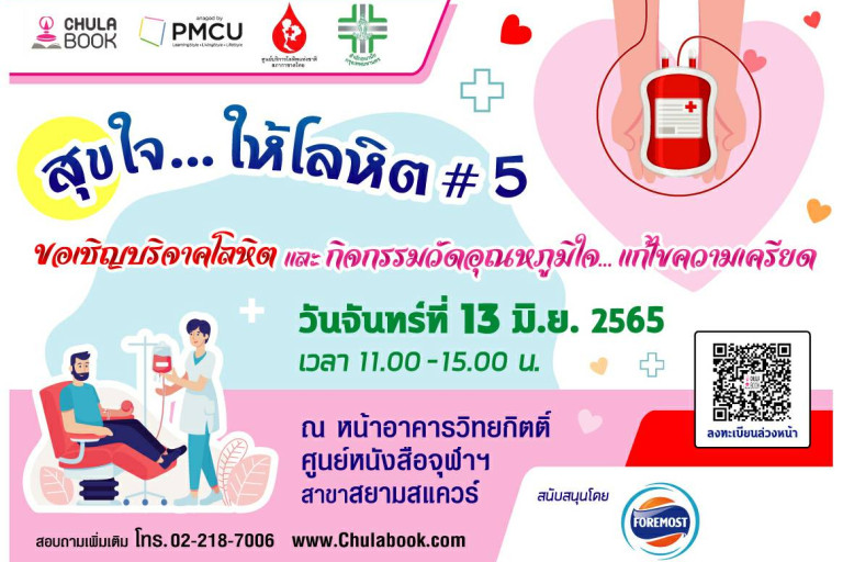 ศูนย์หนังสือจุฬาลงกรณ์มหาวิทยาลัย ร่วมกับ สำนักงานจัดการทรัพย์สินจุฬาลงกรณ์มหาวิทยาลัย จัดกิจกรรม “สุขใจ… ให้โลหิต” ครั้งที่ 5 ในวันจันทร์ที่ 13 มิถุนายน 2565 เวลา 11.00–15.00 น. ณ ด้านหน้าอาคารวิทยกิตติ์ ศูนย์หนังสือจุฬาฯ สยามสแควร์