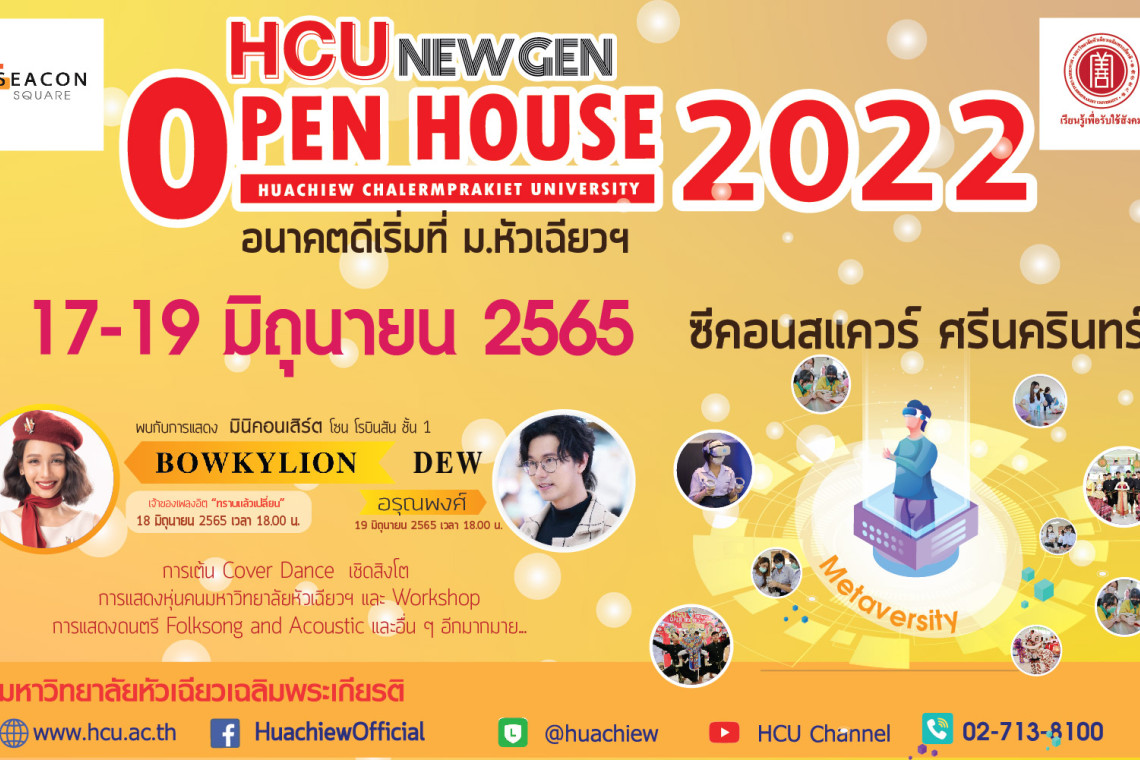 ข่าวดีสำหรับน้อง ๆ ห้ามพลาดอย่างเด็ดขาด ในเดือนมิถุนายน 2565 ม.หัวเฉียวฯ เตรียมยกบ้าน On Tour จัดงาน Open House ไปยังศูนย์สรรพสินค้า ซีคอนสแควร์ ศรีนครินทร์ แบบจุก ๆ 3 วันเต็ม ในวันศุกร์ที่ 17 วันเสาร์ที่ 18 และวันอาทิตย์ที่ 19 มิถุนายน 2565 ตั้งแต่เวลา 11.00-20.00 น. ณ โซนโรบินสัน ชั้น 1 ให้น้องๆนักเรียนและประชาชนทั่วไป ได้รับความรู้ ได้พูดคุยกับอาจารย์และรุ่นพี่จากคณะต่าง ๆ พร้อมกับได้รับความสนุกไปด้วย พร้อมความพิเศษแบบสุด ๆ อาทิ VR Zone นวัตกรรมการเรียนการสอนแบบโลกเสมือนจริง การแสดงหุ่นคนม.หัวเฉียวฯ ที่เดียวในประเทศไทย มินิคอนเสิร์ตพิธีเปิดงานจาก Bowkylion ในวันเสาร์ที่ 18 และปิดท้ายวันอาทิตย์ที่ 19 กับดิว อรุณพงศ์ เป็นต้น รับรองความสนุก เต็มอิ่มกับความรู้ รู้จักตัวตน และค้นพบคณะที่ใช่สาขาที่ชอบในงานนี้แน่นอน