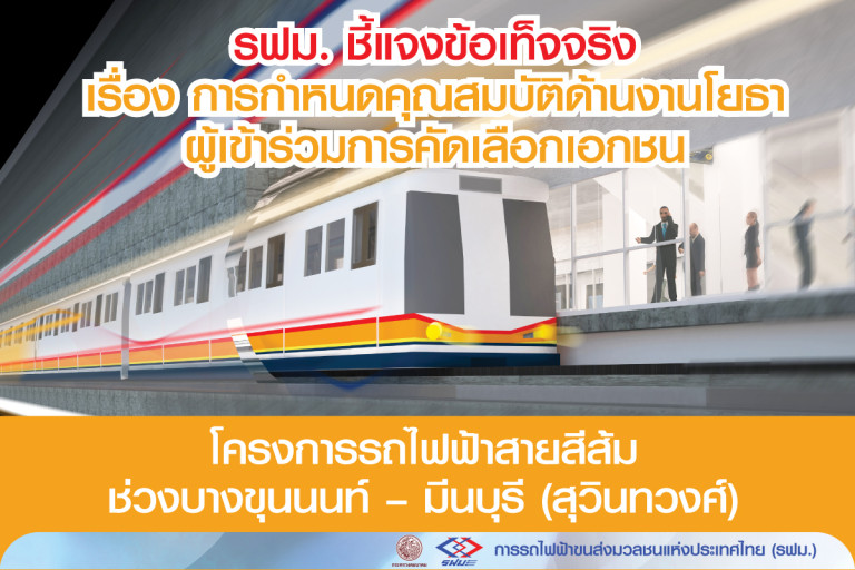 ตามที่ การรถไฟฟ้าขนส่งมวลชนแห่งประเทศไทย (รฟม.) ได้มีข่าวประชาสัมพันธ์ เมื่อวันที่ 31 พฤษภาคม 2565 ชี้แจงข้อเท็จจริง เรื่อง การประกาศเชิญชวนการร่วมลงทุนระหว่างรัฐและเอกชน โครงการรถไฟฟ้าสายสีส้ม ช่วงบางขุนนนท์ – มีนบุรี (สุวินทวงศ์) รฟม. ขอยืนยันข้อเท็จจริงในประเด็นการกำหนดคุณสมบัติด้านงานโยธาและด้านเทคนิคของการคัดเลือกเอกชนร่วมลงทุน โครงการรถไฟฟ้าสายสีส้มฯ ดังนี้