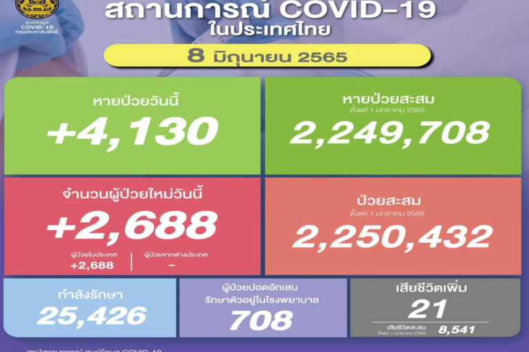 วันที่ 8 มิ.ย.2565 ศูนย์ข้อมูล COVID-19 รายงานยอดผู้ติดเชื้อโควิด-19 รายใหม่จำนวน 2,688 ราย ทำให้ยอดผู้ป่วยสะสมตั้งแต่ 1 มกราคม 2565 มีจำนวน 2,250,432 ราย หายป่วยกลับบ้าน 4,130 ราย ทำให้ยอดหายป่วยสะสม ตั้งแต่ 1 มกราคม 2565 มีจำนวน 2,249,708 ราย ผู้ป่วยกำลังรักษา 25,426 ราย และเสียชีวิต 21 ราย รวมเสียชีวิตสะสมตั้งแต่ ปี 2563-ปัจจุบัน จำนวน 30,239 ราย