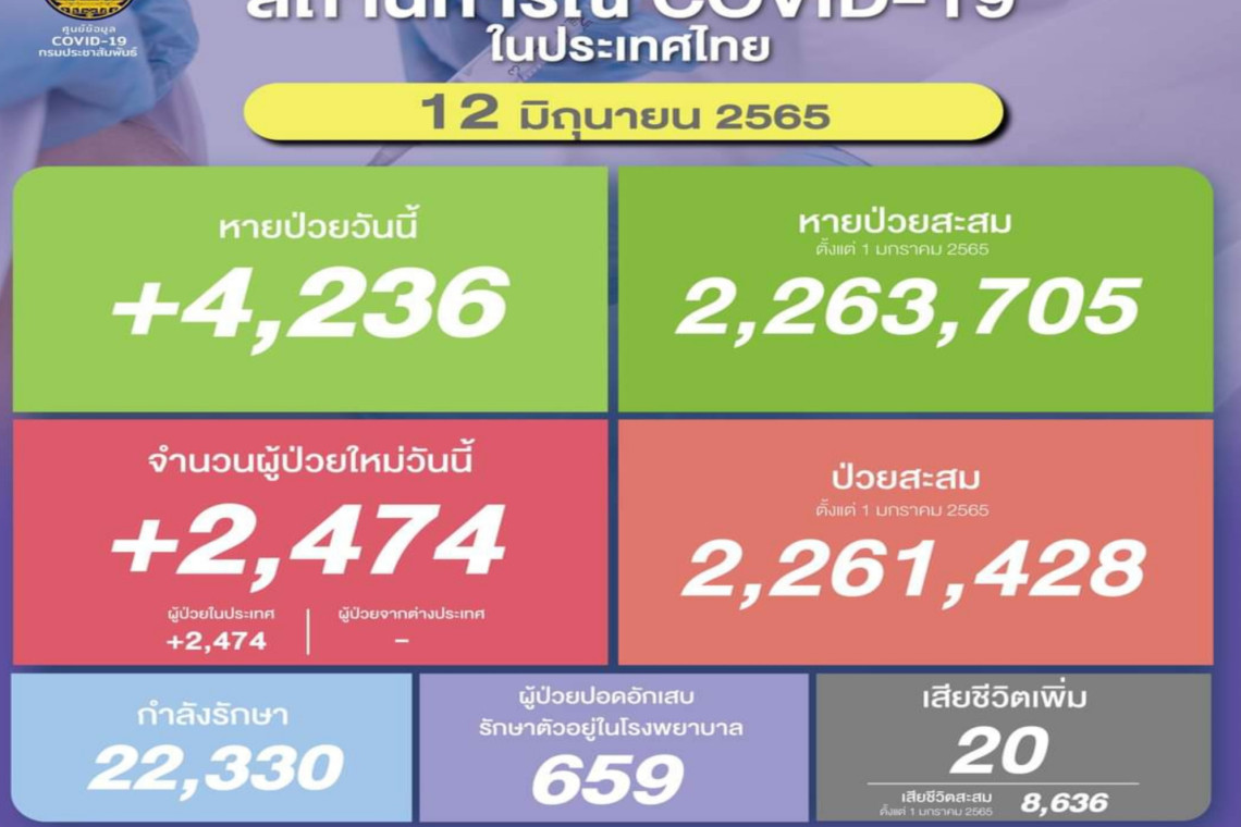 วันที่ 12 มิ.ย.2565 ศูนย์ข้อมูล COVID-19 รายงานยอดผู้ติดเชื้อโควิด-19 รายใหม่จำนวน 2,474 ราย ทำให้ยอดผู้ป่วยสะสมตั้งแต่ 1 มกราคม 2565 มีจำนวน 2,261,428 ราย หายป่วยกลับบ้าน 4,236 ราย ทำให้ยอดหายป่วยสะสม ตั้งแต่ 1 มกราคม 2565 มีจำนวน 2,263,705 ราย ผู้ป่วยกำลังรักษา 22,330 ราย และเสียชีวิต 20 ราย รวมเสียชีวิตสะสมตั้งแต่ ปี 2563-ปัจจุบัน จำนวน 30,334 ราย