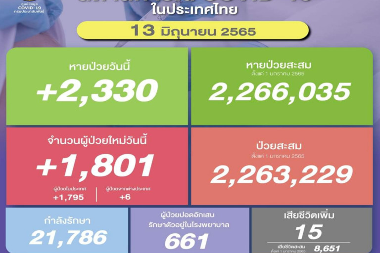 วันที่ 13 มิ.ย.2565 ศูนย์ข้อมูล COVID-19 รายงานยอดผู้ติดเชื้อโควิด-19 รายใหม่จำนวน 1,801 ราย ทำให้ยอดผู้ป่วยสะสมตั้งแต่ 1 มกราคม 2565 มีจำนวน 2,263,229 ราย หายป่วยกลับบ้าน 2,330 ราย ทำให้ยอดหายป่วยสะสม ตั้งแต่ 1 มกราคม 2565 มีจำนวน 2,266,035 ราย ผู้ป่วยกำลังรักษา 21,789 ราย และเสียชีวิต 15 ราย รวมเสียชีวิตสะสมตั้งแต่ ปี 2563-ปัจจุบัน จำนวน 30,349 ราย